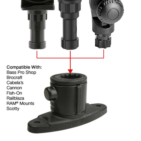 - Universal post and spline base compatible with post and spline systems from RAM® Mounts, Scotty, Fish-On, Railblaza, Cannon, Brocraft, Cabela's and Bass Pro Shops