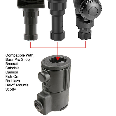 - Universal post and spline base compatible with post and spline systems from RAM® Mounts, Scotty, Fish-On, Railblaza, Cannon, Brocraft, Cabela's and Bass Pro Shops